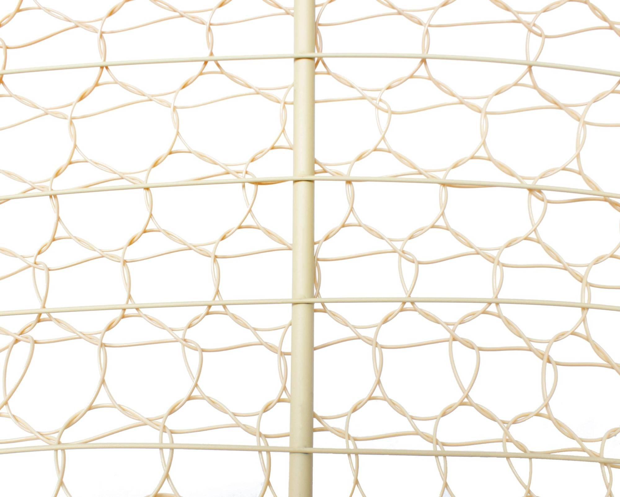 Стойка для садовых качелей выполнена из металла с порошковым покрытием. Стальной каркас-кокон исполнен по особой технологии с декоративным, плетением из искусственного экоротанга собственного производства (прочным материалом, без запаха, не восприимчивым к неблагоприятным температурным и погодным условиям). Корпус качели с ротангом выдерживает нагрузку до 120 кг.