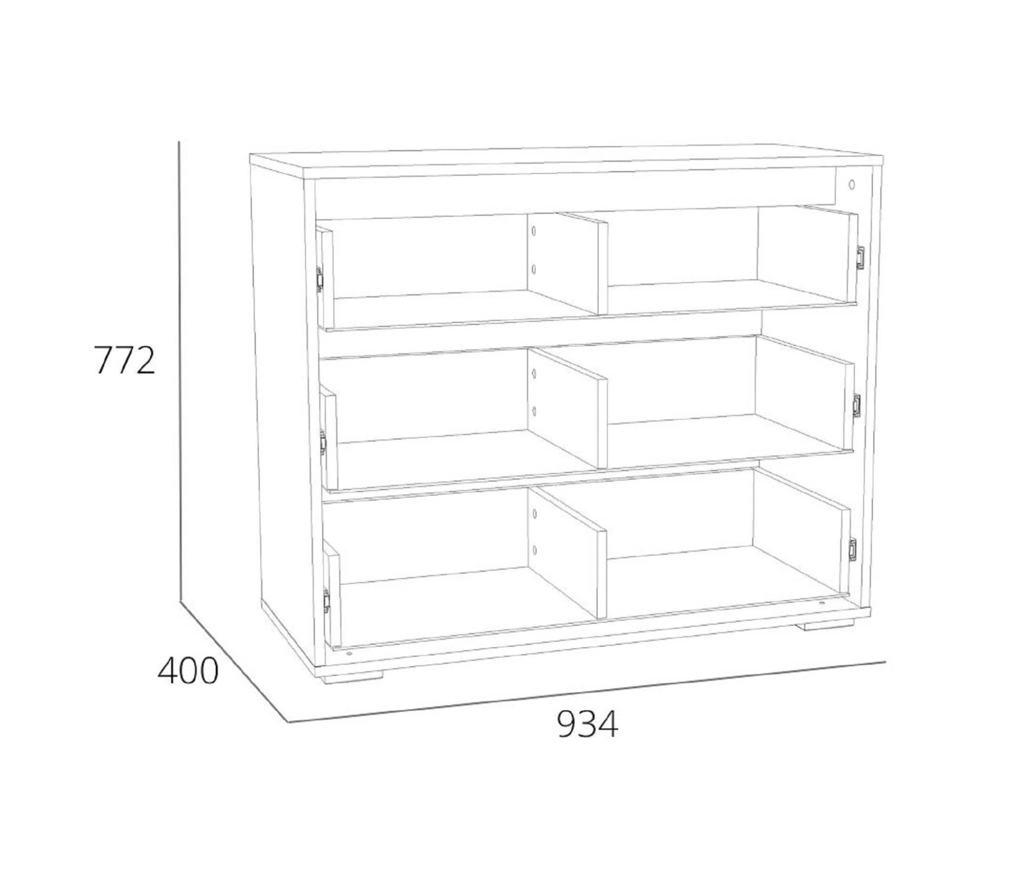 Также дизайн комода завершают стильные квадратные ручки в количестве 6 штук.