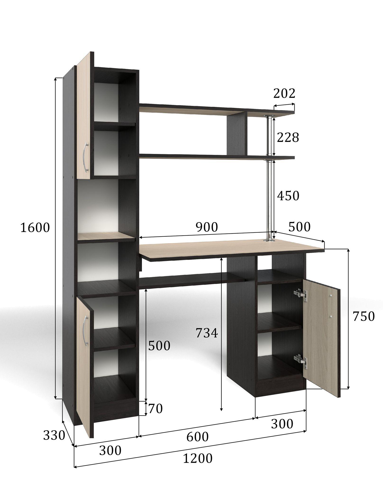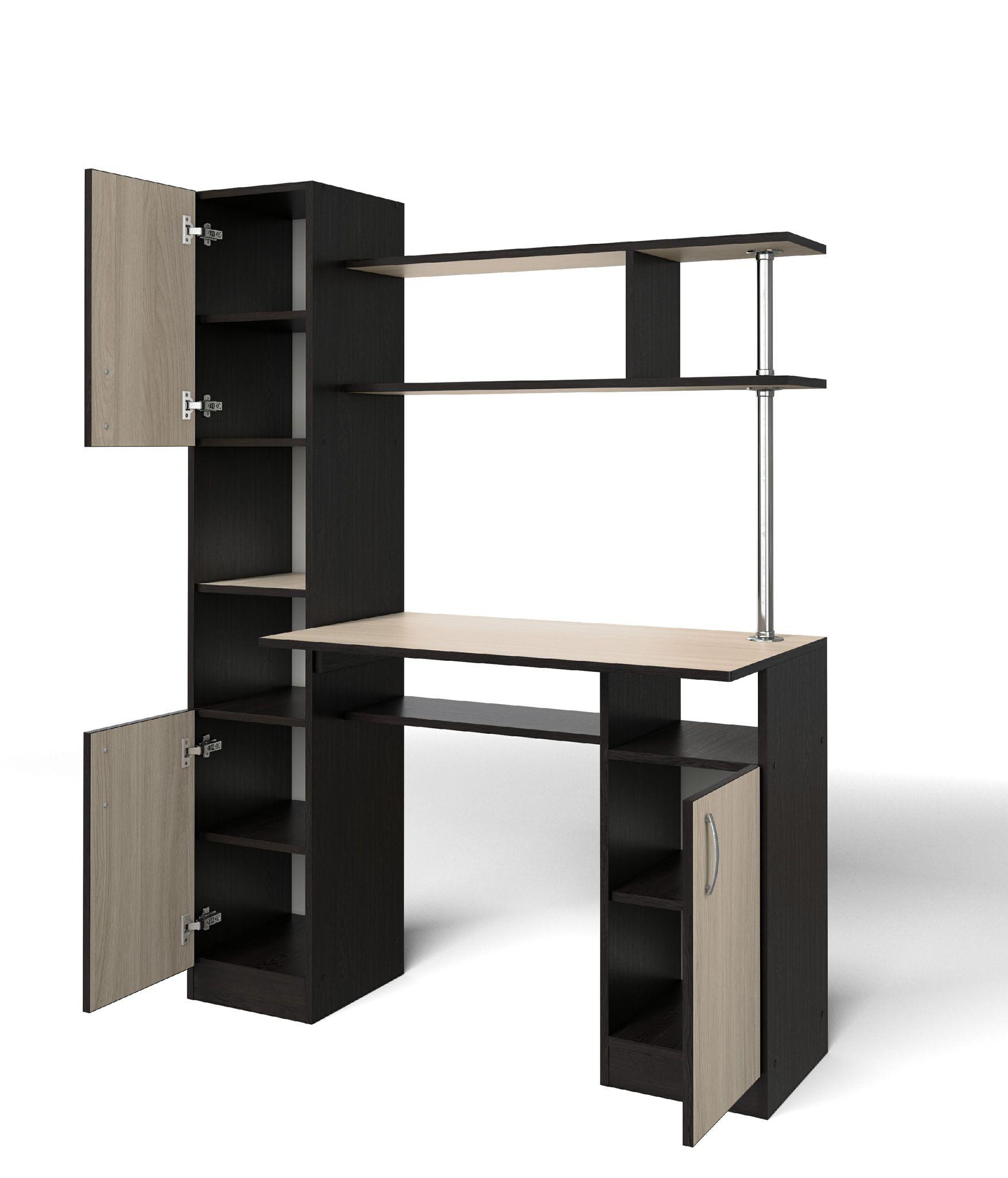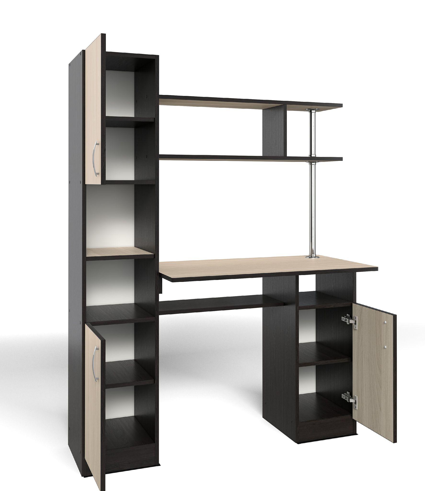 У стола есть удобный вместительный пенал. В правой части за дверцей расположена одна полка. Над столешницей предусмотрена удобная надстройка, при этом она не забирается пространства столешницы.