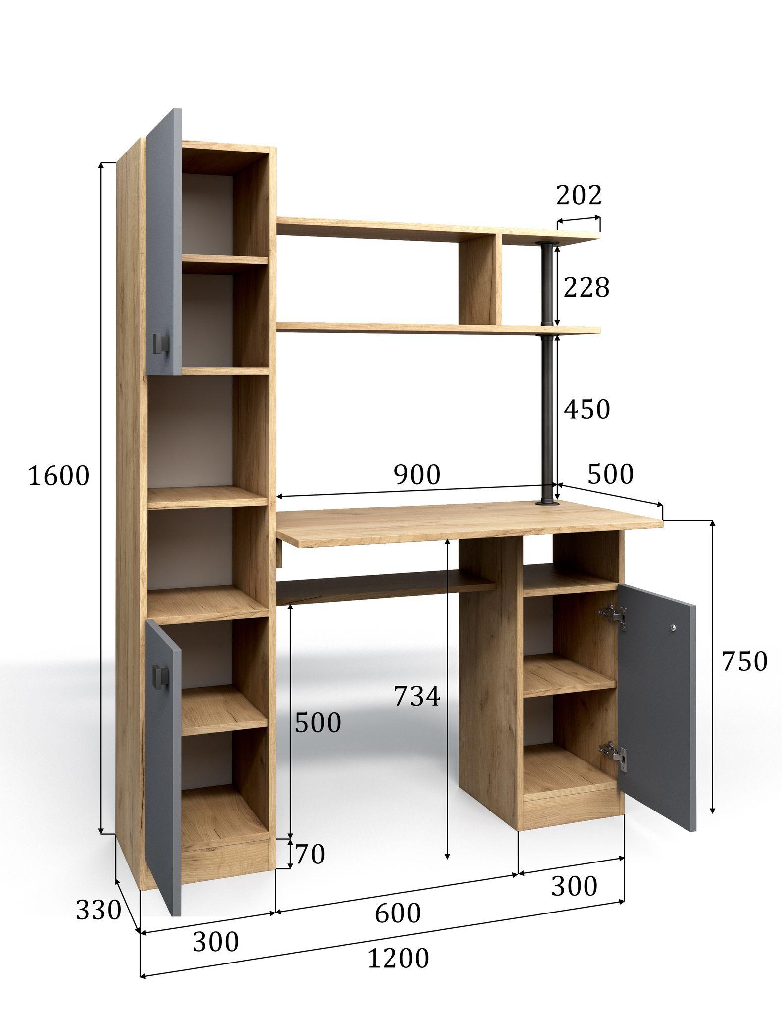 У стола есть удобный вместительный пенал. В правой части за дверцей расположена одна полка. Над столешницей предусмотрена удобная надстройка, при этом она не забирается пространства столешницы.