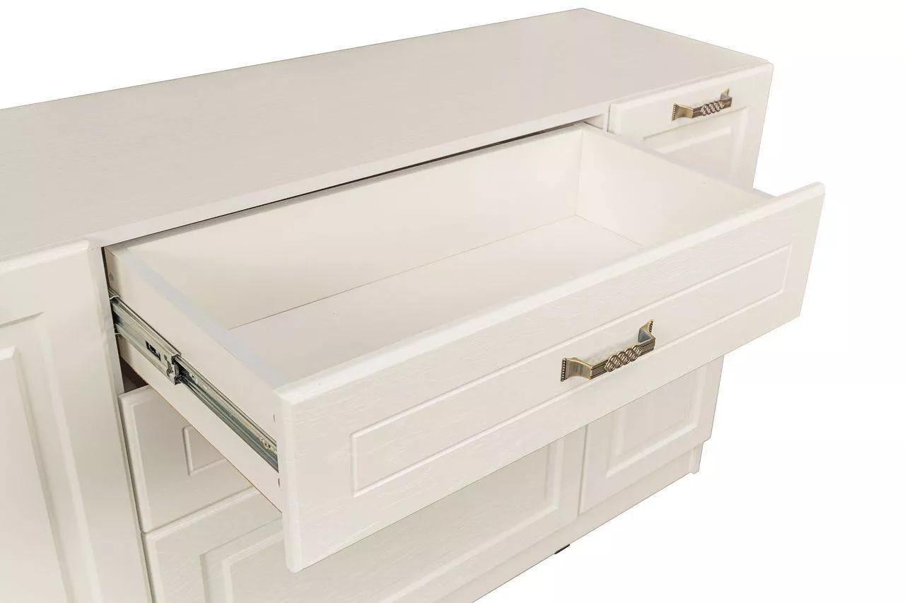 Модуль изготовлена из ЛДСП 16 мм, фасады выполнены из МДФ 16 мм, с кромкой из ПВХ 0,4 мм. Распашные дверки установлены на четырехшарнирные петли, выдвижные ящики на шариковых направляющих. Ручки - металл в цвете "Старая бронза".