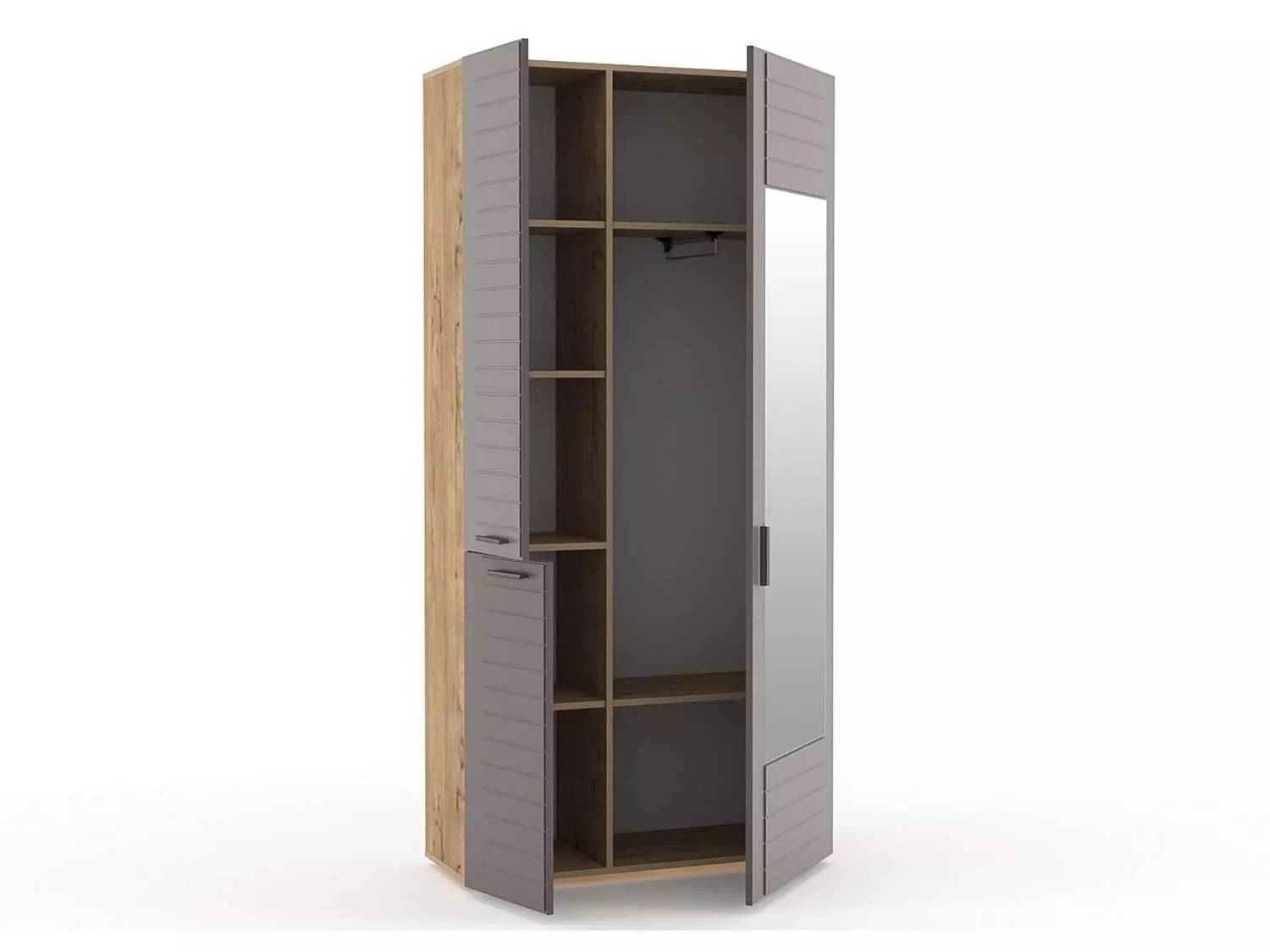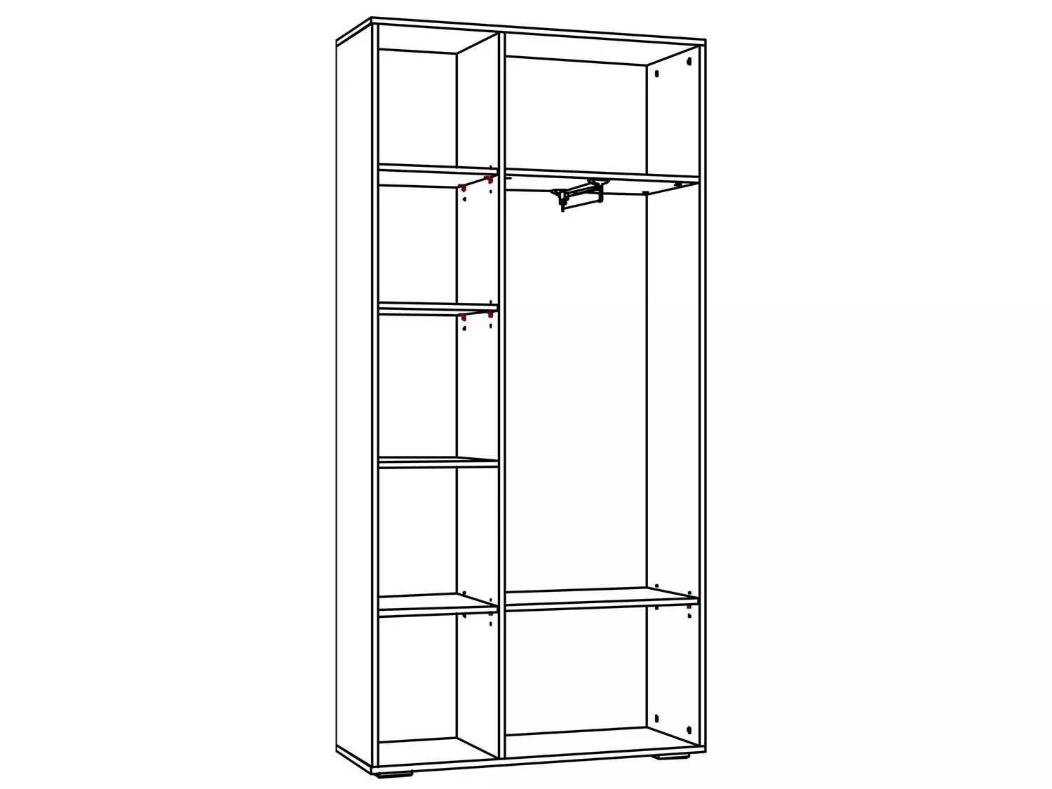 Шкаф имеет две секции и две глухих и одну зеркальную распашные двери, за которыми расположены 7 полок для хранения и телескопическая штанга для плечиков с одеждой.