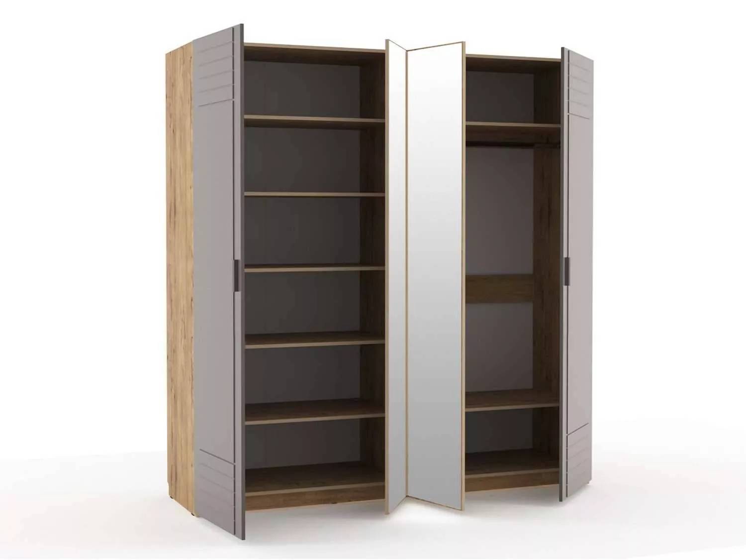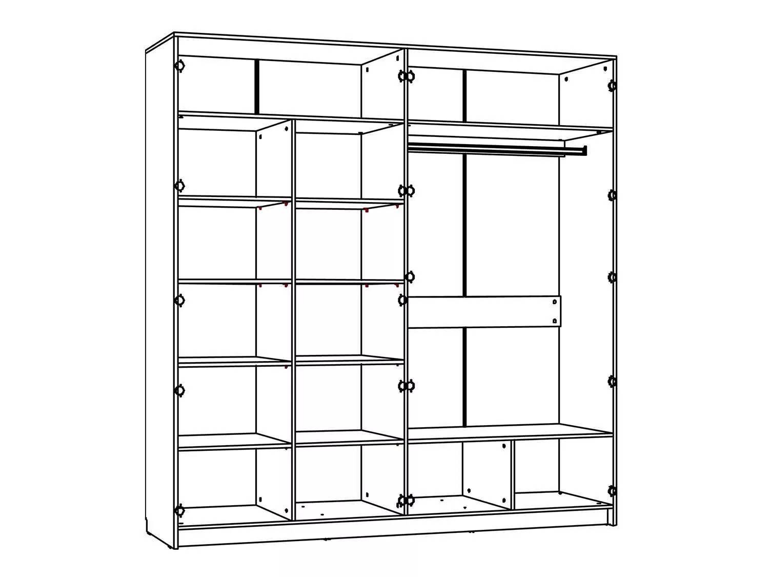 Шкаф имеет две секции, закрывающиеся четырьмя распашными дверцами. Две центральные двери зеркальные. Внутри расположены 14 полок для хранения и горизонтальная штанга для плечиков с одеждой.