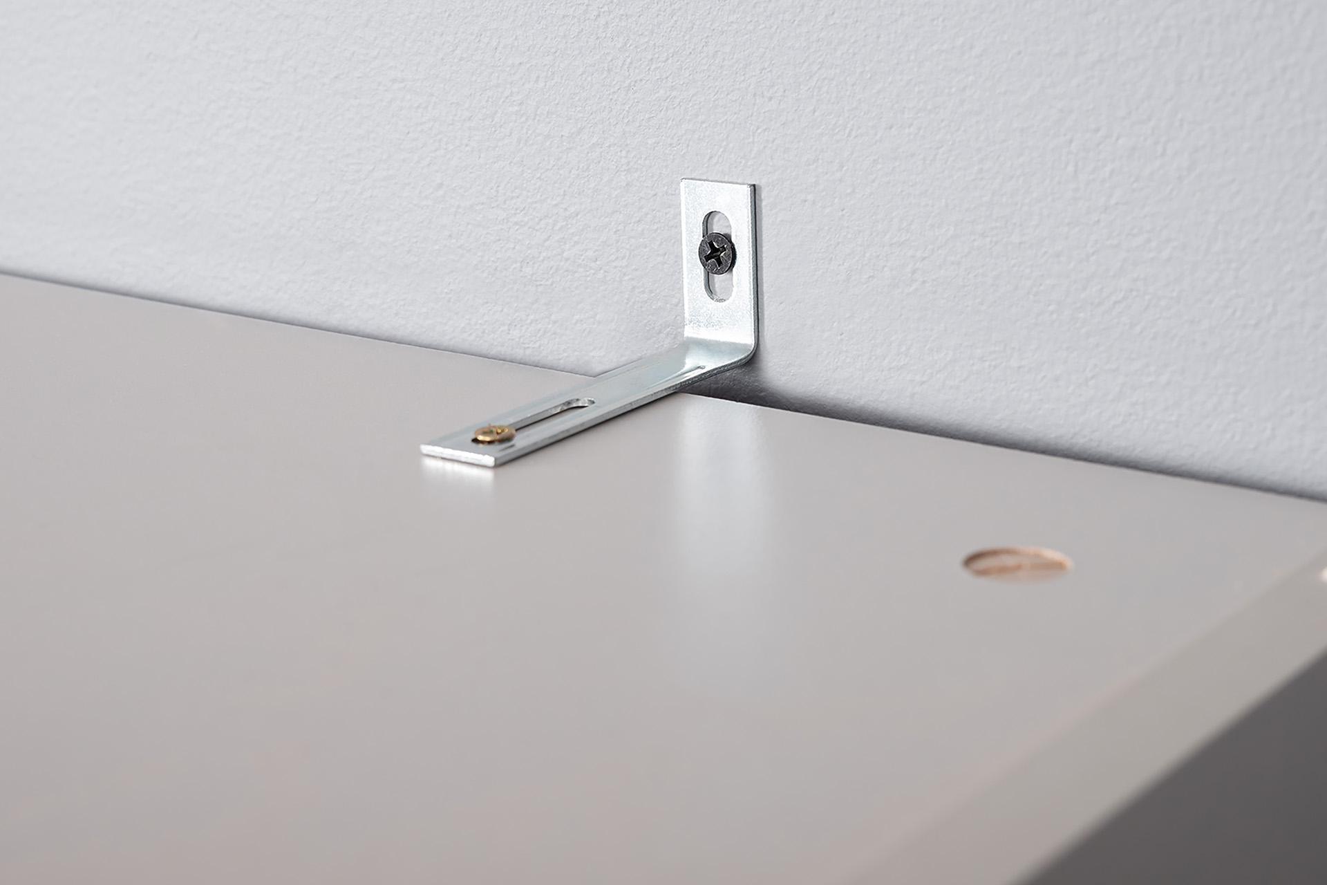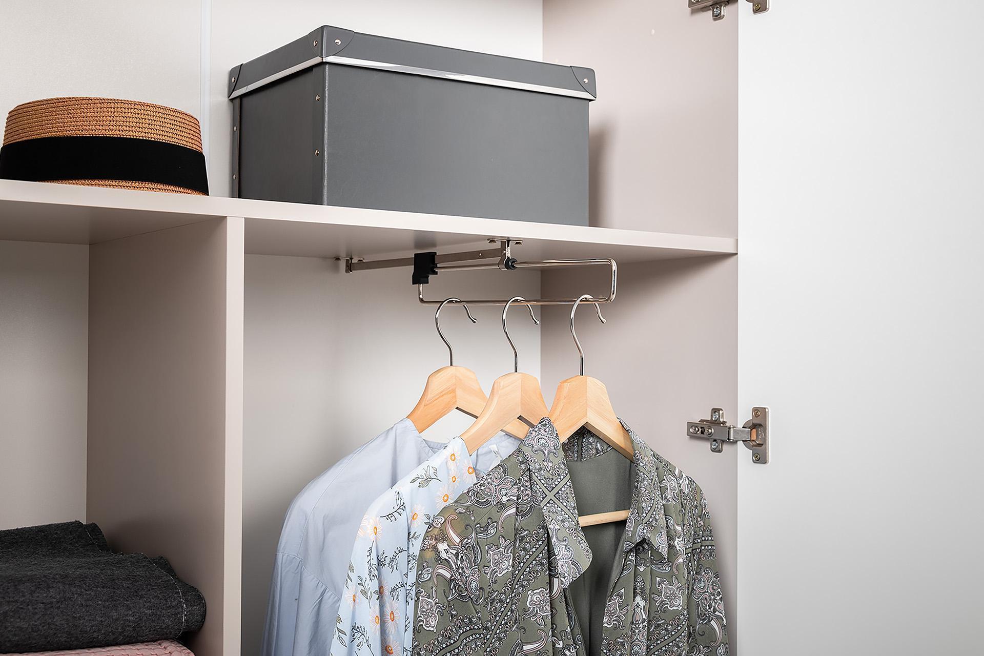 Выдвижная штанга в шкафу для одежды и съемные полки делают использование максимально комфортным.