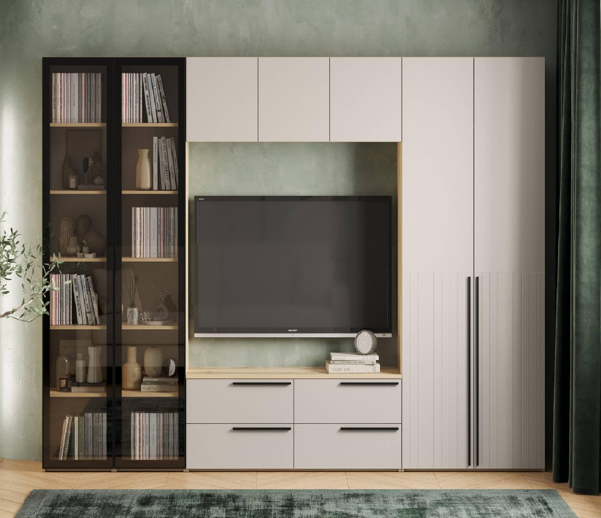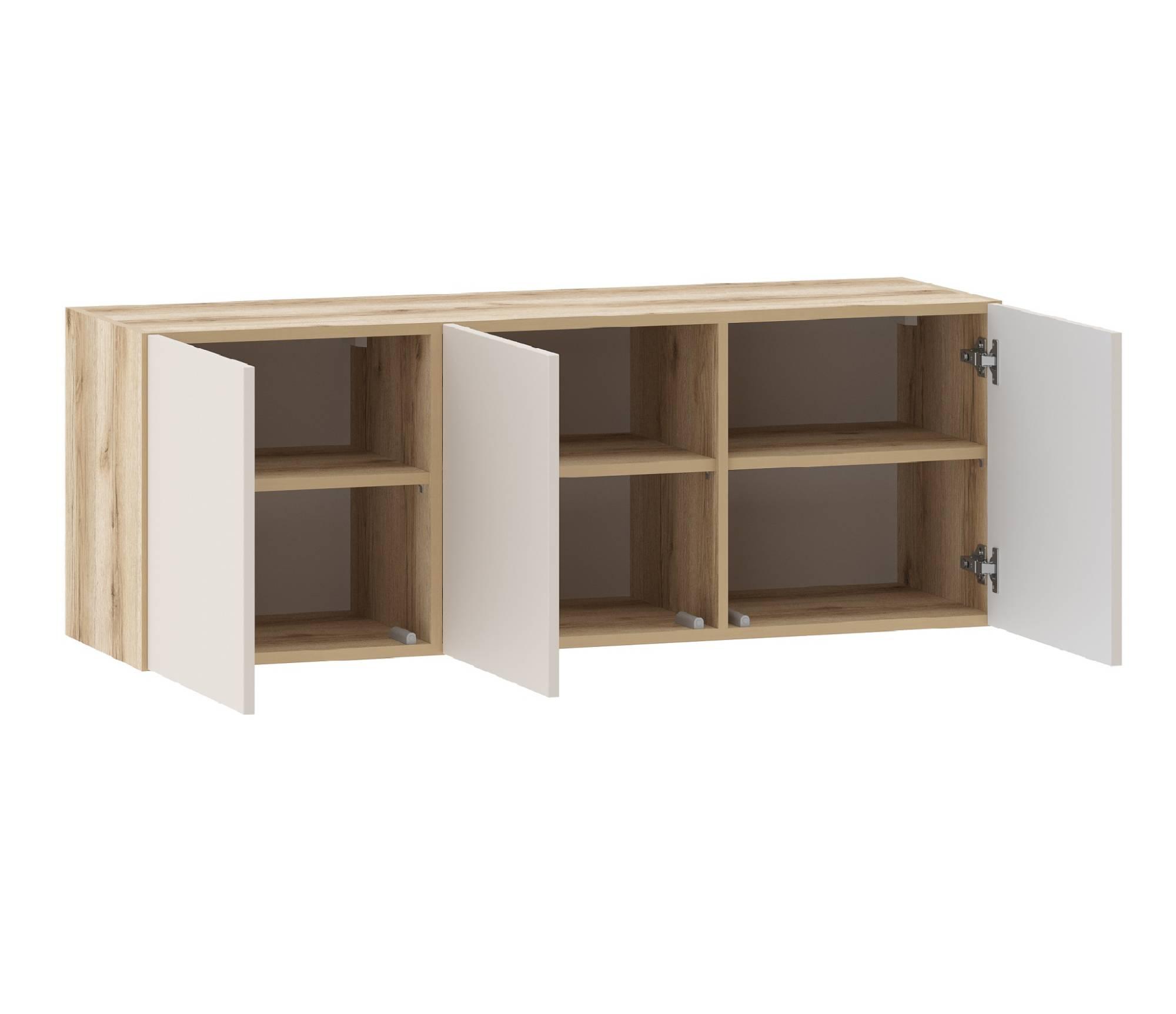 Шкаф с тремя вместительными нишами разделенные полками и скрытыми за глухими распашными дверцами.