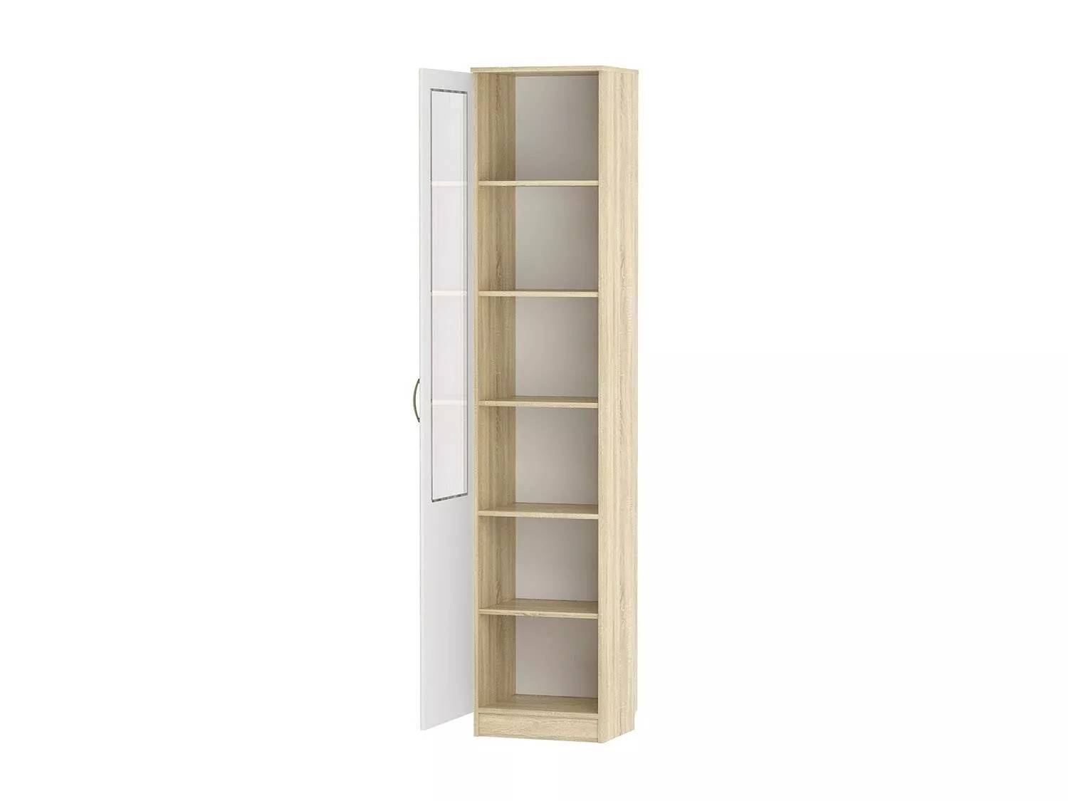 Шкаф оснащен шестью полками для хранения и распашной дверцей со стеклянной вставкой. Дверь открывается справа налево.