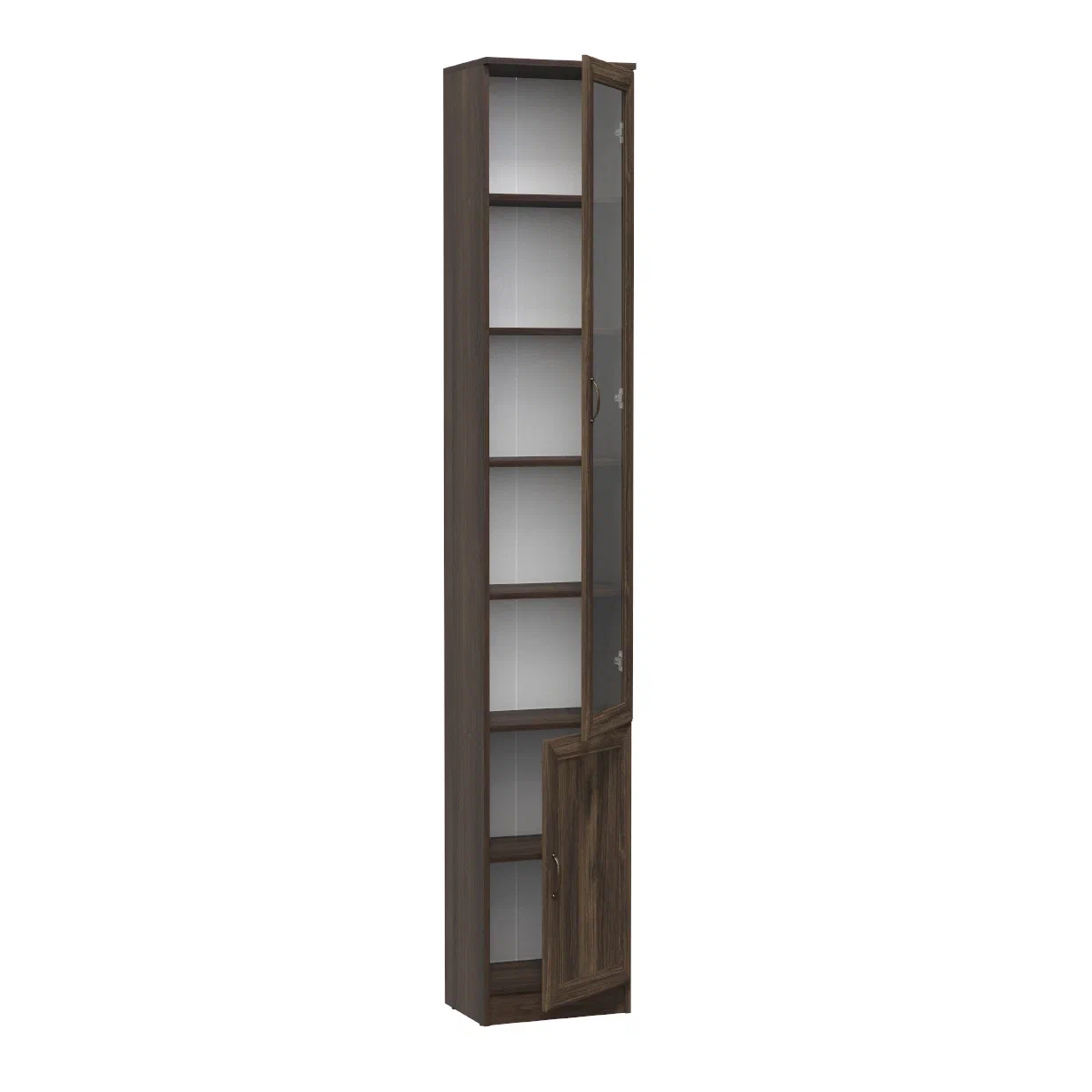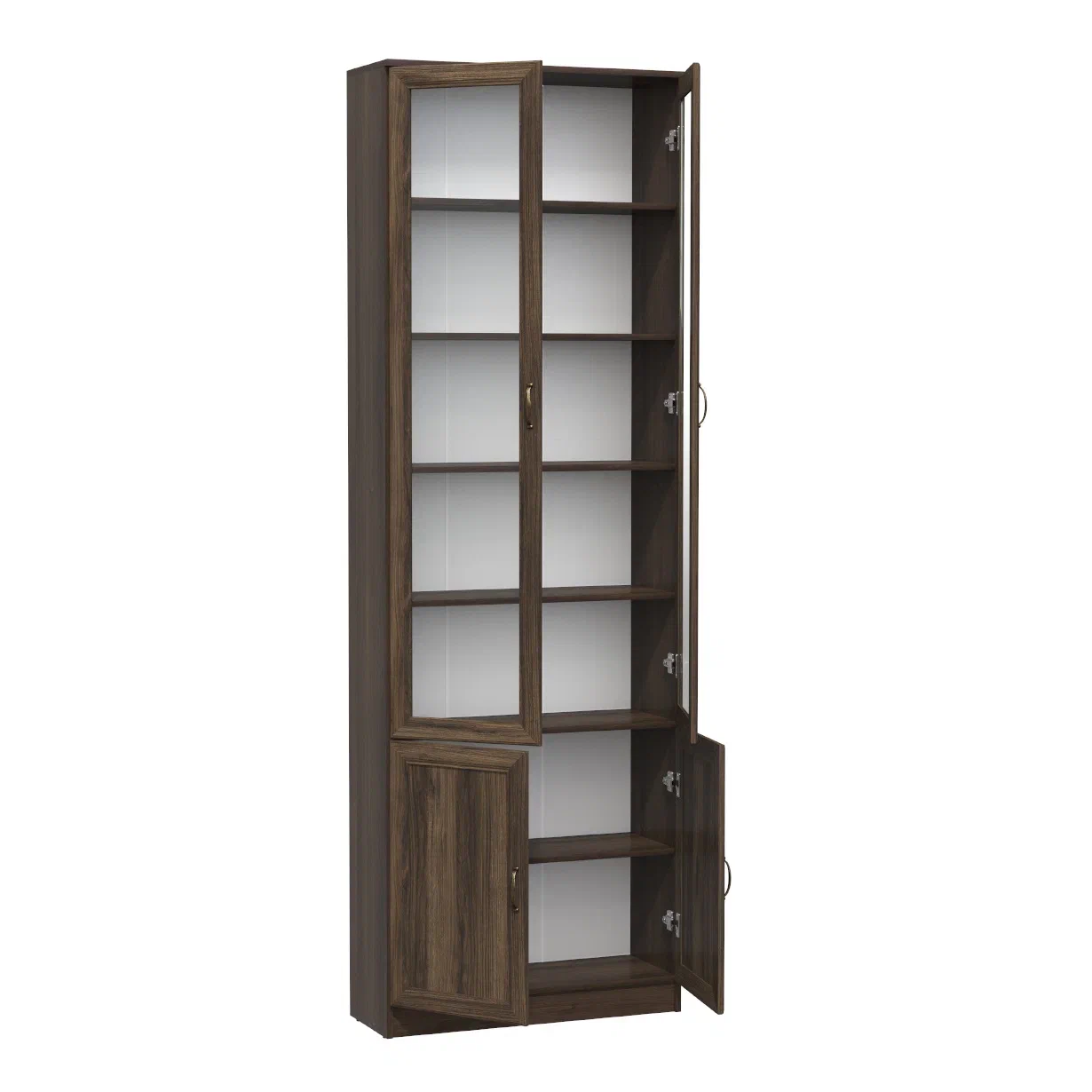 за сплошными дверцами внизу, а на верхних полках за стеклянными дверями вы
