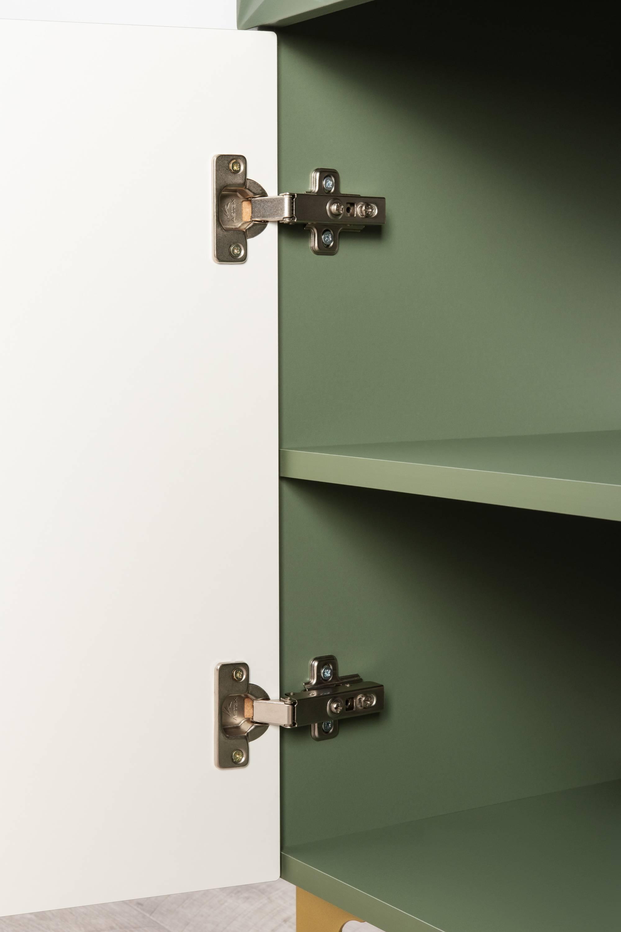 Нижняя дверка глухая, за которой полочки из ЛДСП.