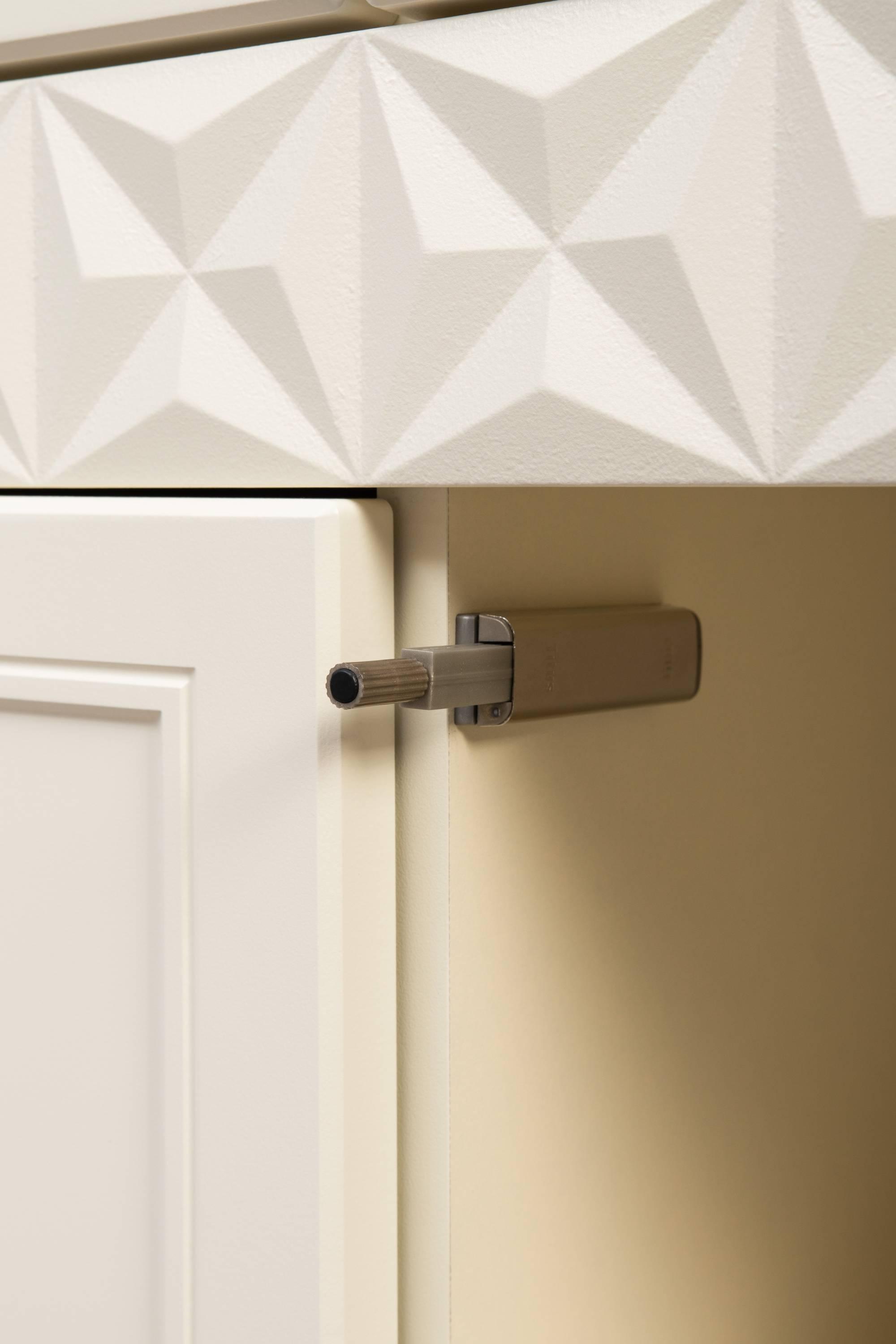 Верхние двери со вставкой из тонированного закаленного стекла, за которой стеклянные полки для хранения.