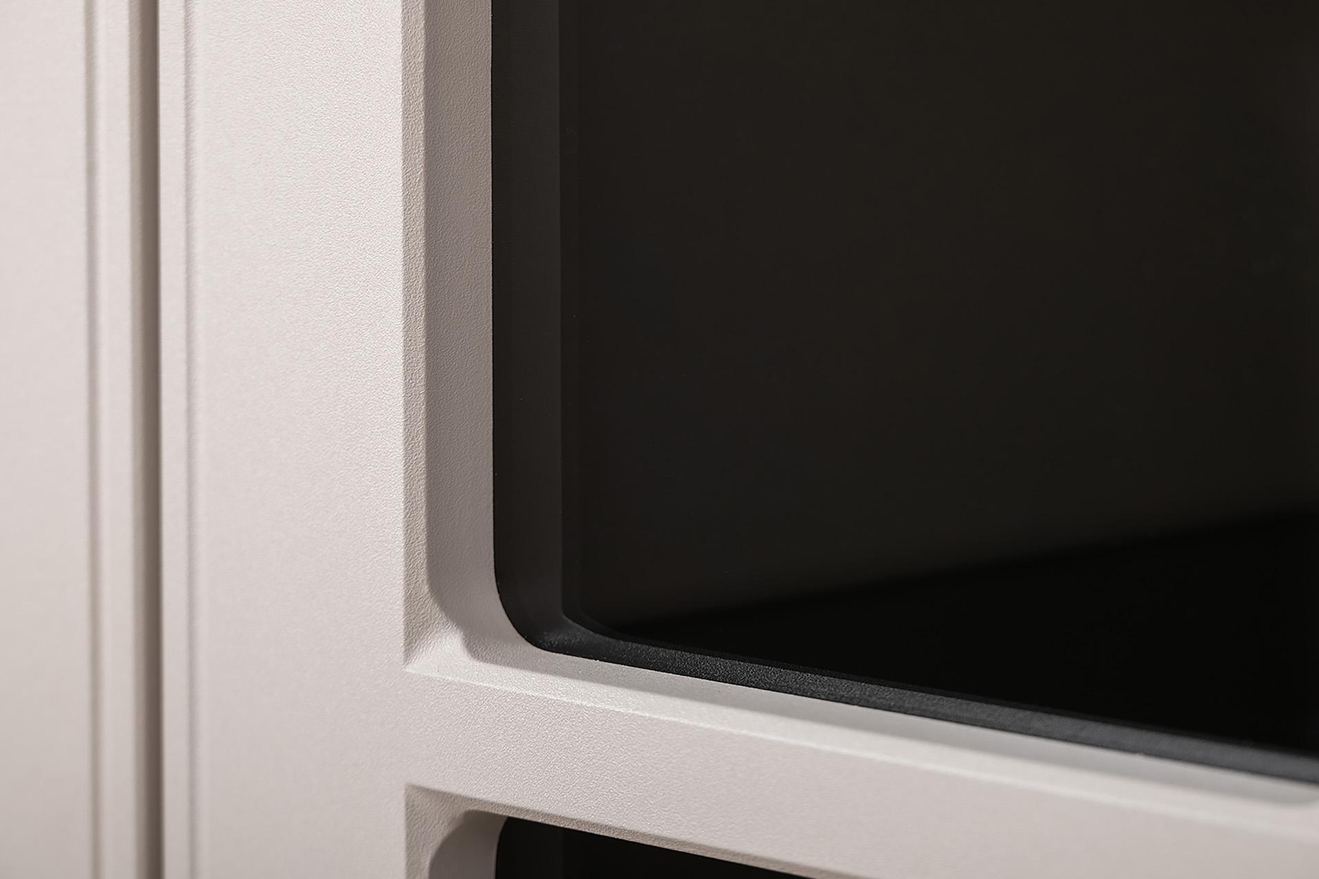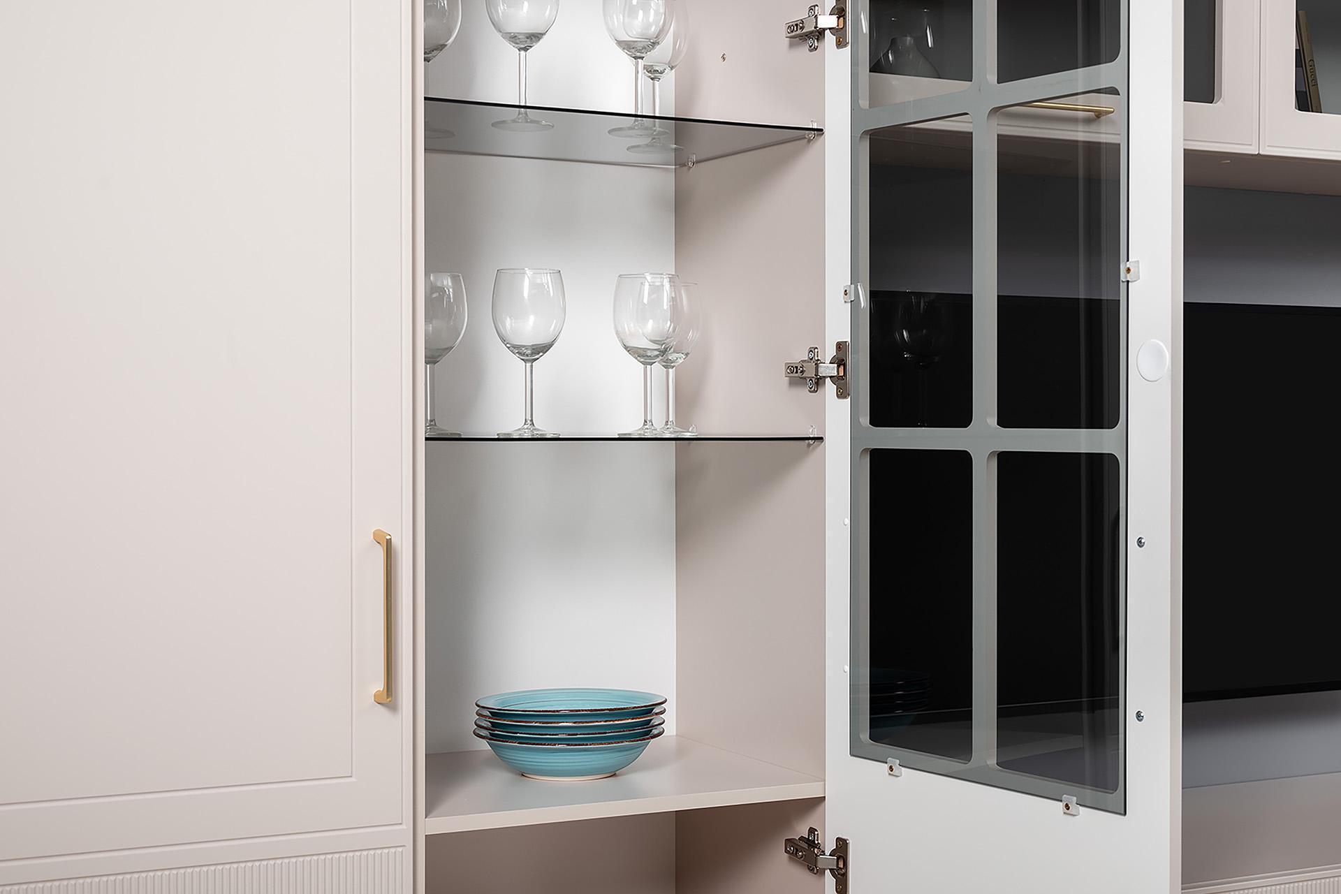 За дверцей съемные полки делают использование максимально комфортным.