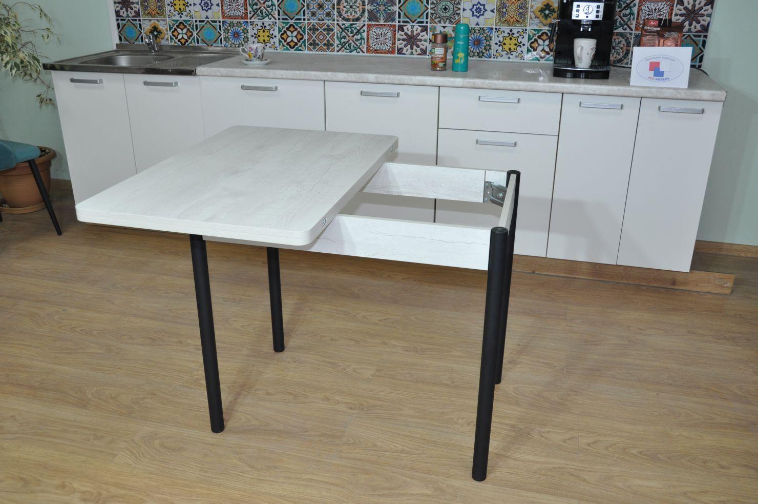 У стола раскладная столешница с размером в разложенном виде 900 х 1200 мм.