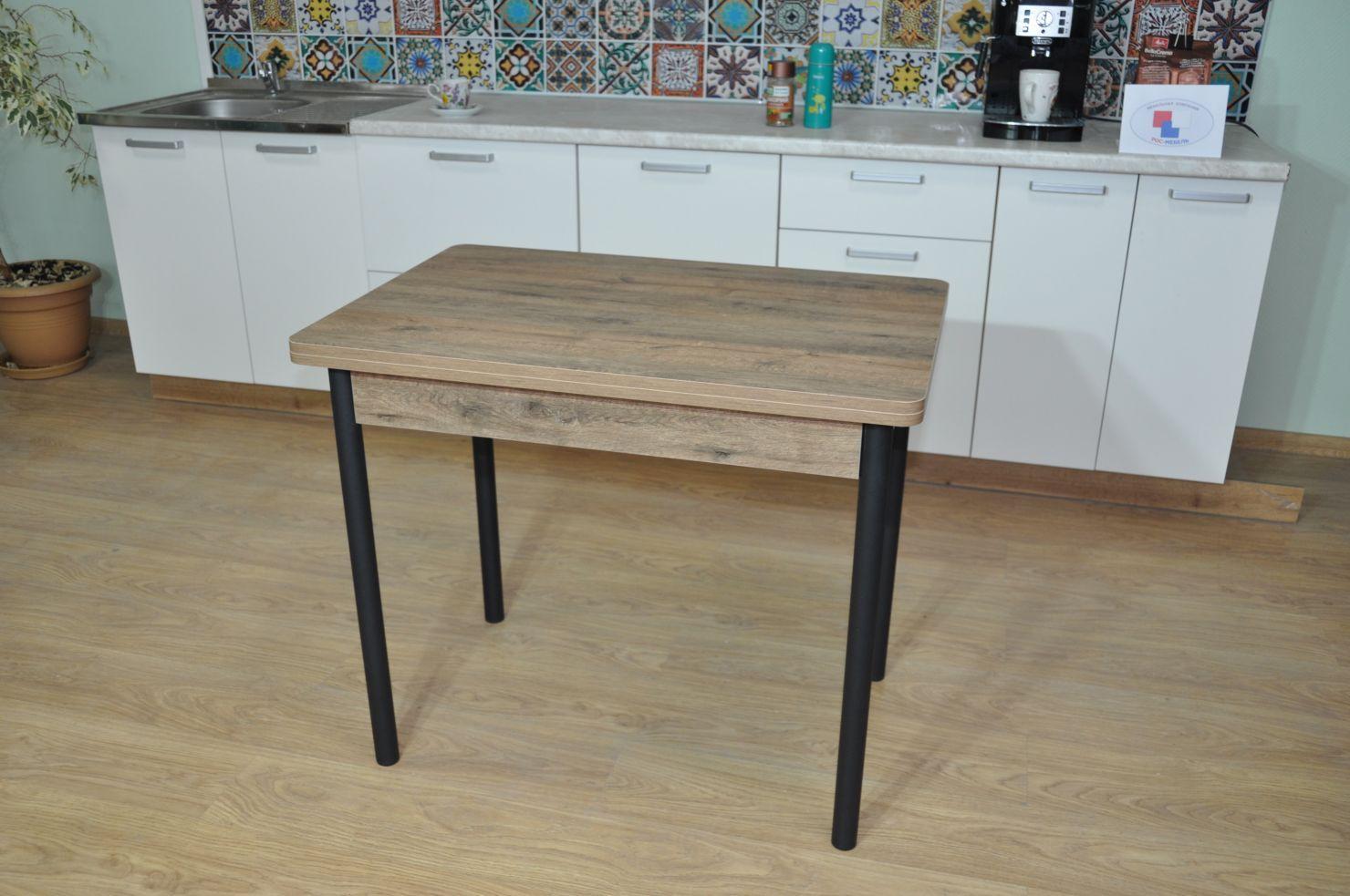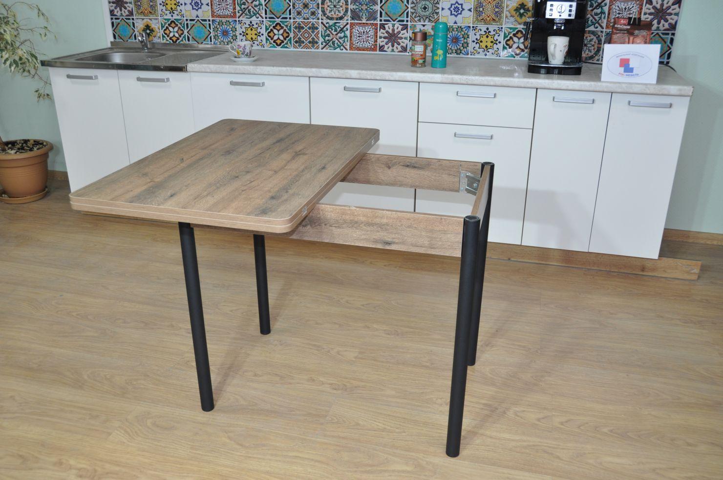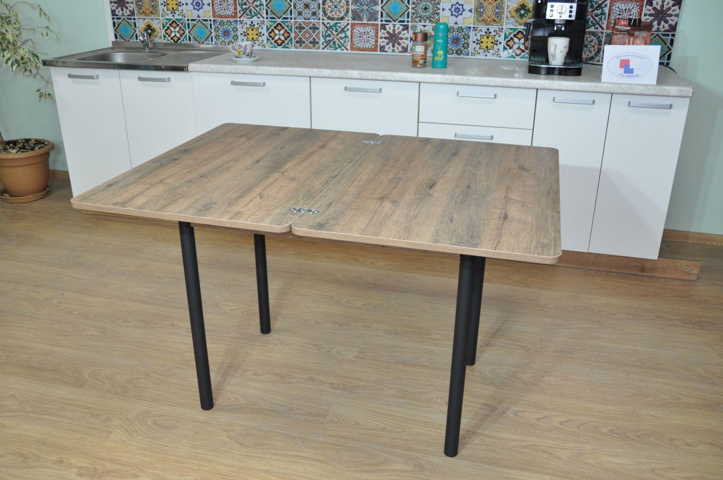 У стола раскладная столешница с размером в разложенном виде 900 х 1200 мм.