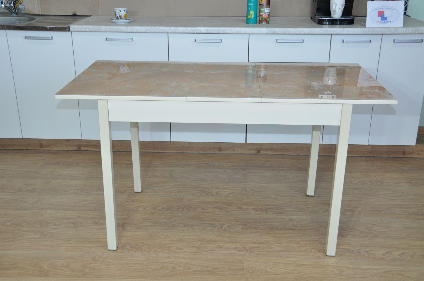 Стол выполнен на металлических опорах квадратного сечения.