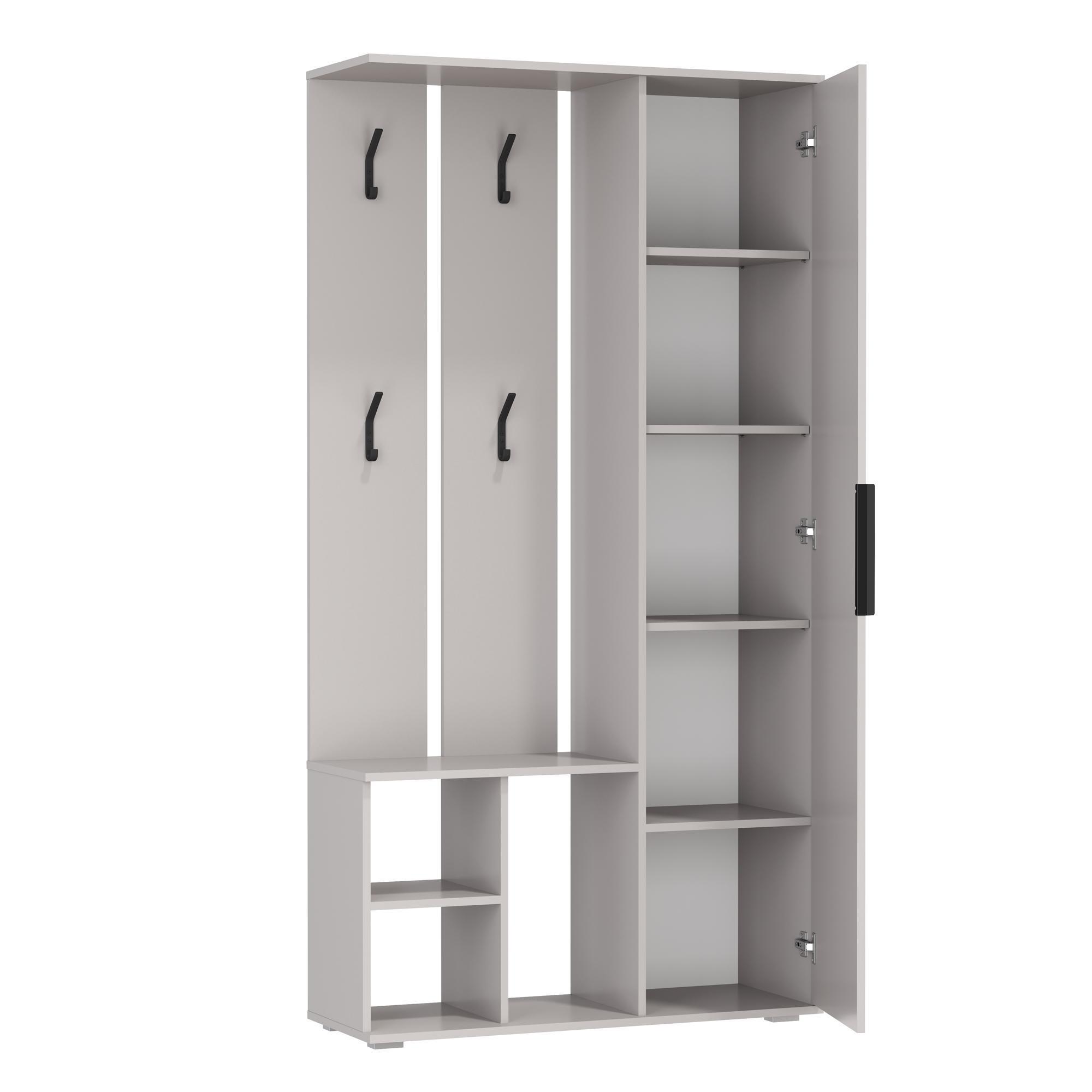 Конструкция мини-прихожей включает в себя крючки для верхней одежды, полки для хранения за распашной дверкой и открытые ниши снизу.