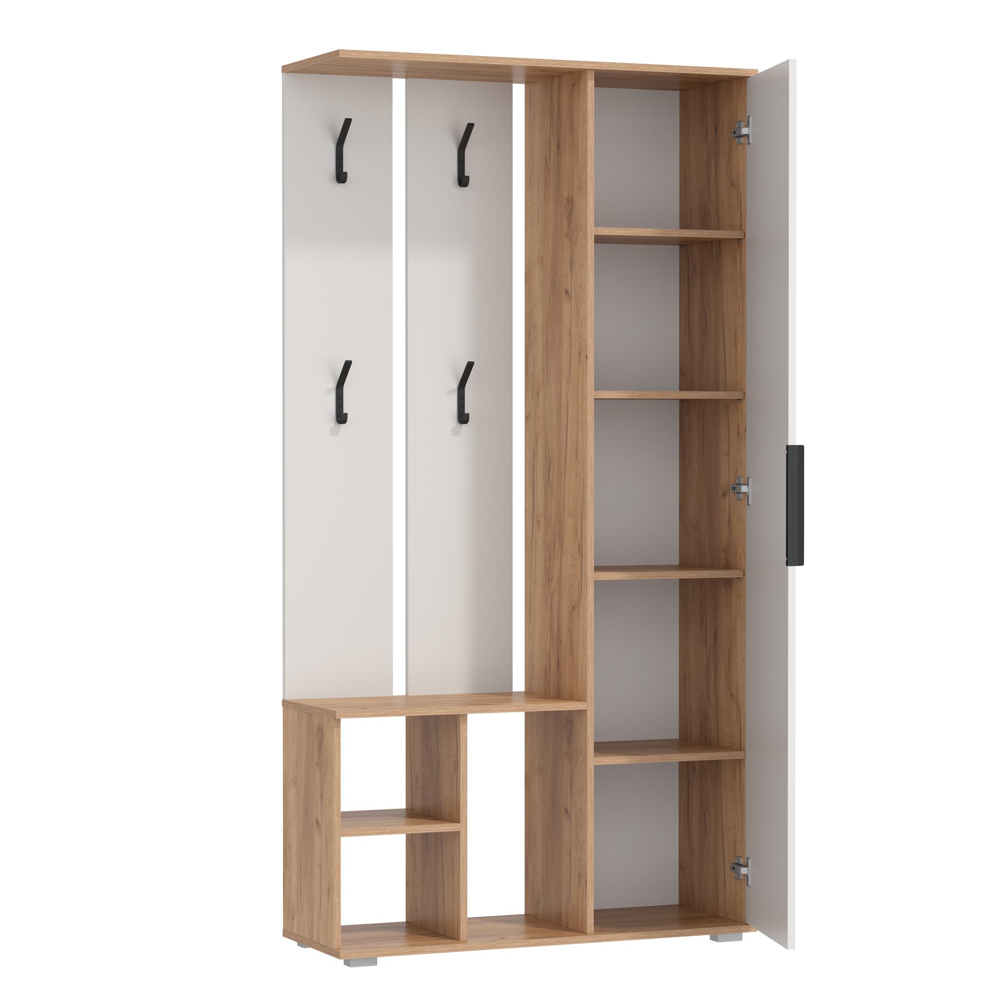 Конструкция мини-прихожей включает в себя крючки для верхней одежды, полки для хранения за распашной дверкой и открытые ниши снизу.