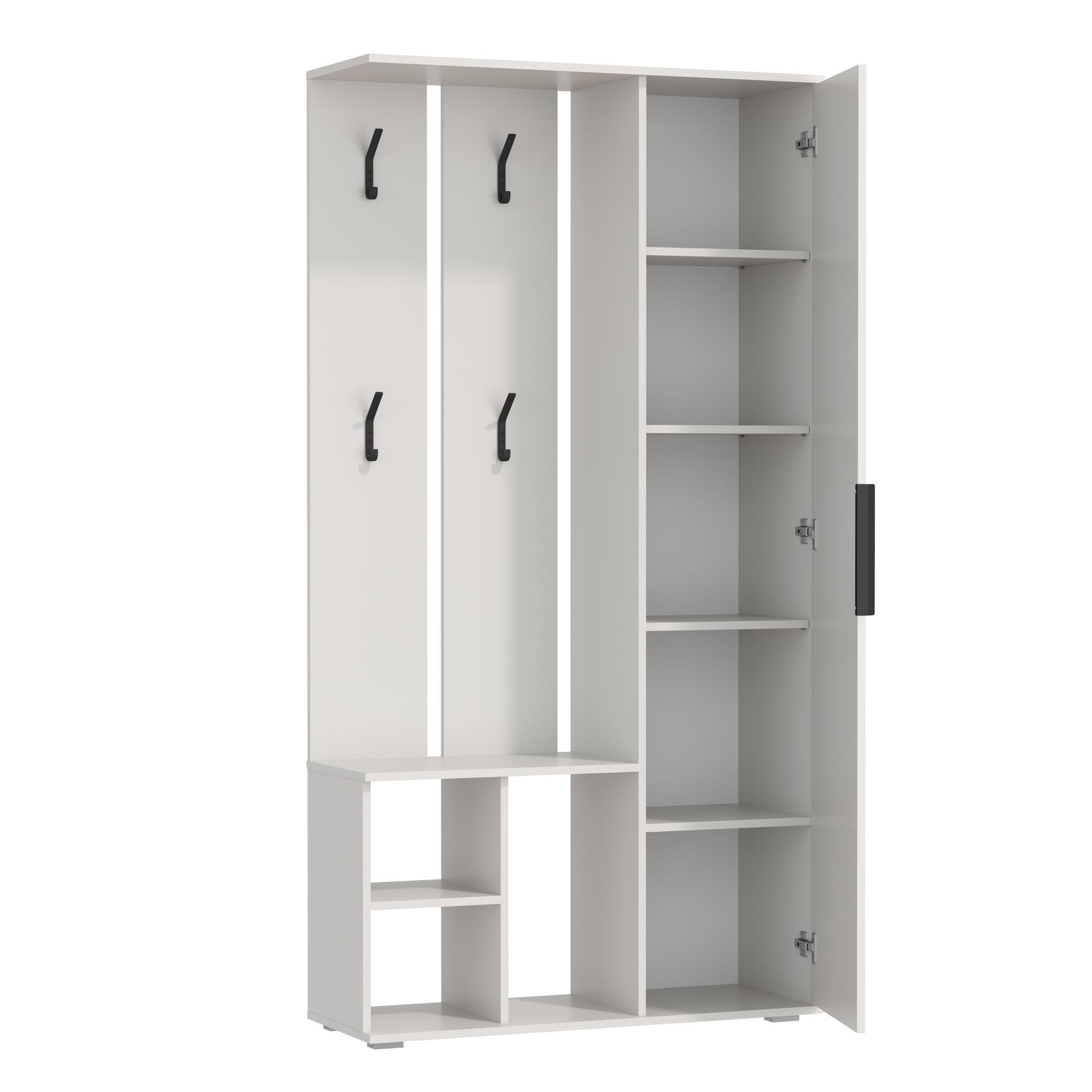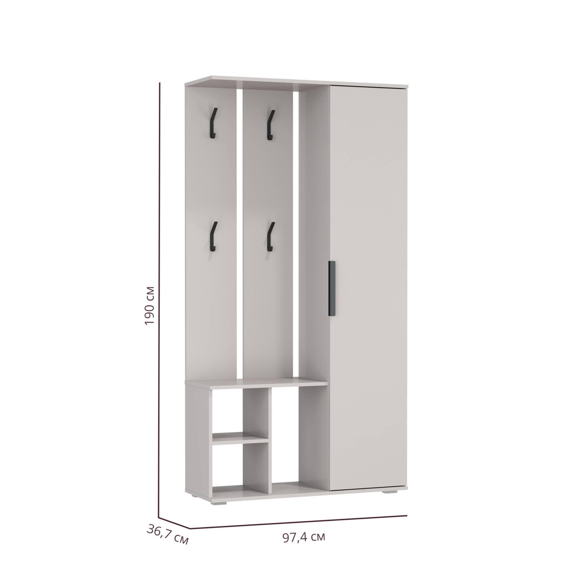 Конструкция мини-прихожей включает в себя крючки для верхней одежды, полки для хранения за распашной дверкой и открытые ниши снизу.