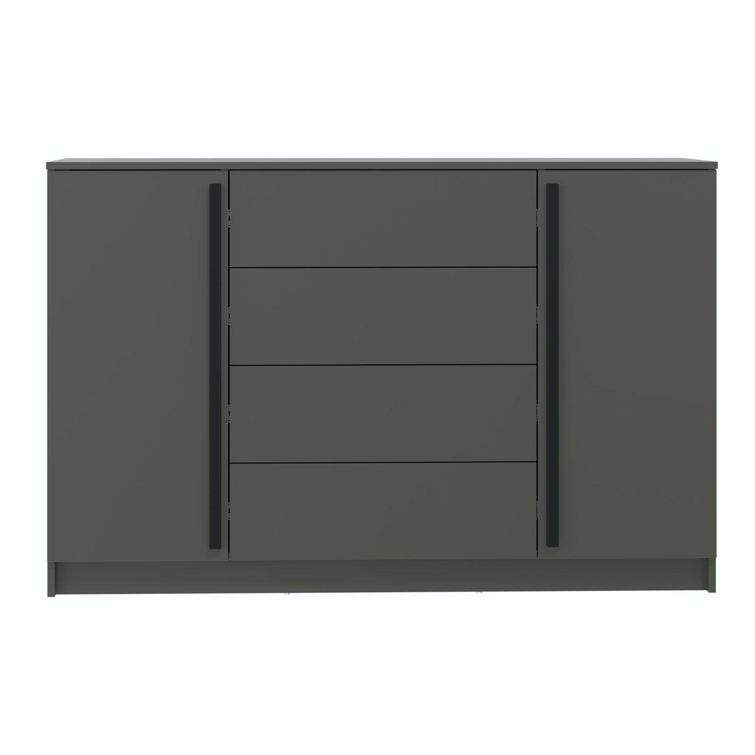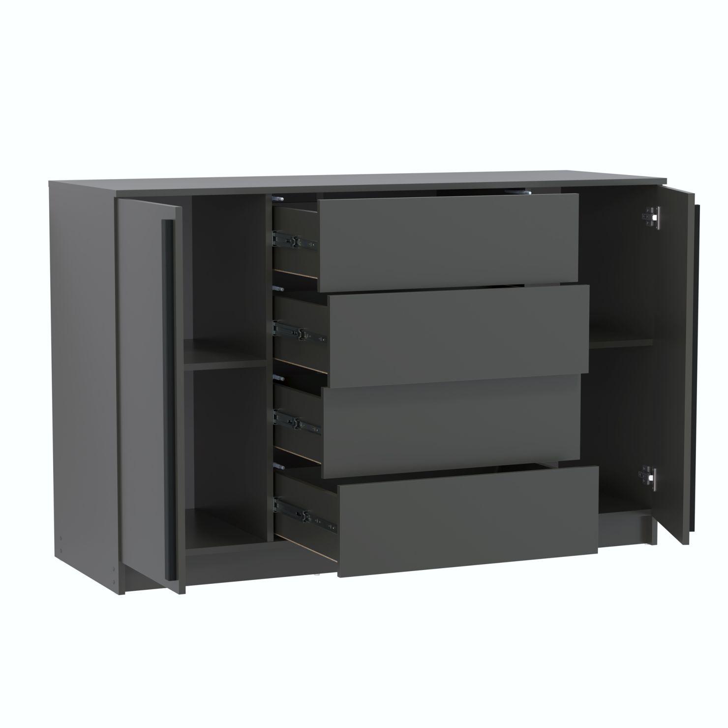 Конструкция комода с 4 выдвижными ящиками и двумя отделами для хранения с распашными дверками.